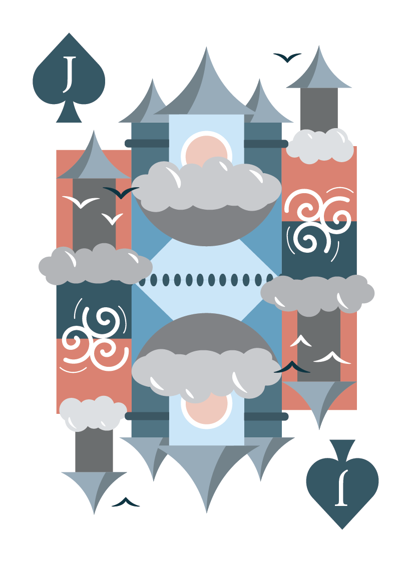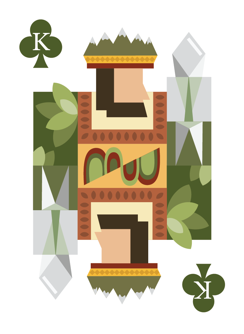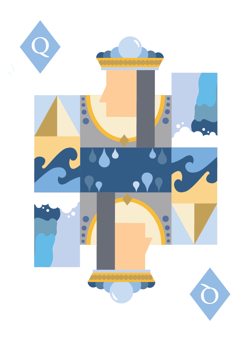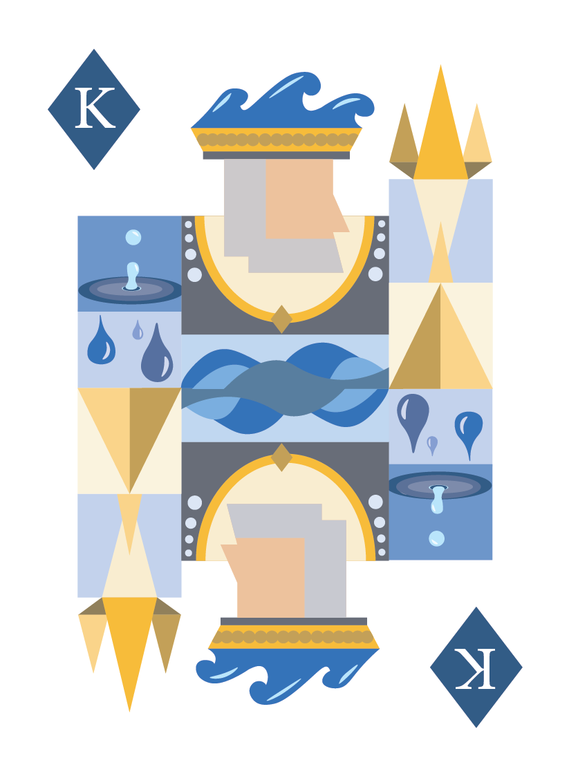 This special edition set of poker-sized playing cards' concept stemmed from an early notion of linking the four elements Earth, Fire, Water, and Air, to the four suits, a foundational idea that directed the entire design. The design maintains a traditional card layout including reflections, original suit icons, and a consistent design pattern on the numbered cards; while incorporating intricate geometric patterns. Each face card section represents various aspects of its respective element. This personalized deck has both a sophisticated and whimsical quality.
